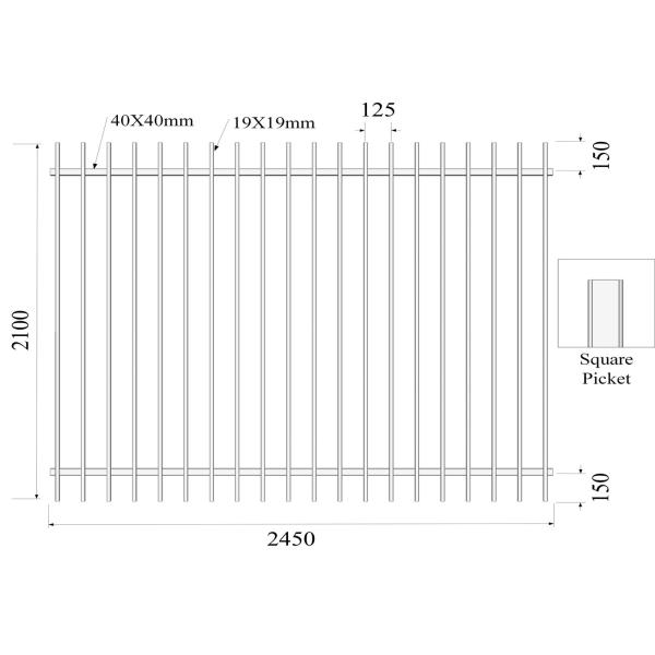 Square Picket 19mm x 19mm Upright 2100mmx2450mm height 2 rails 40mmSHS powder coated black Garrison Fencing Panels Images |